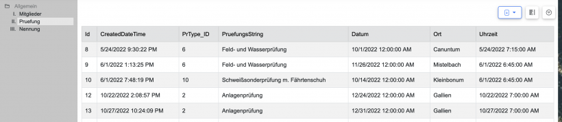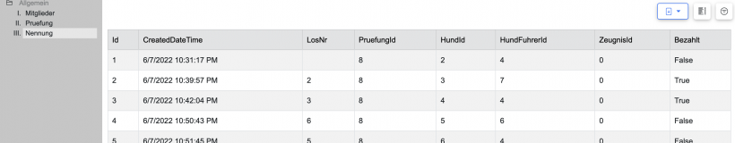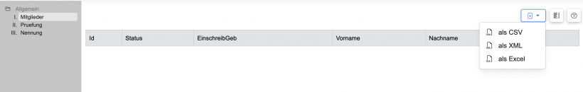 Im linken Bereich, stehen die zu Verfügung stehenden Tabellen, rechts können sie innerhalb der Daten darin arbeiten. Der linke Bereich gliedert sich unter Allgemein in: I.Mitglieder II.Prüfung III.Nennung.