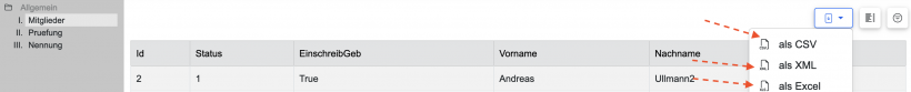 das erste Symbol definiert den Dateityp, in welchem ihre Daten exportiert werden können, hier können sie durch Anklicken 3 Formate auswählen: CSV, XML, oder Excel.