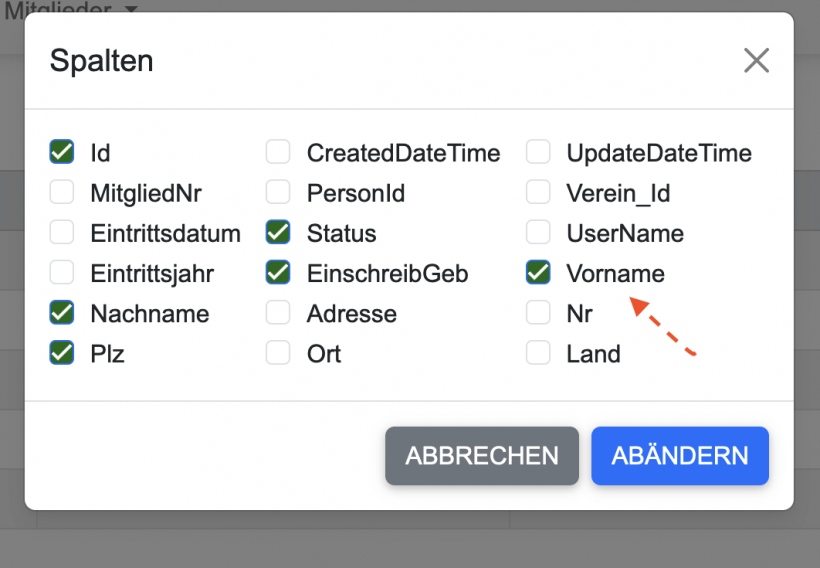 Durch Klicken auf das Spalten-Symbol (rechts davon); hier können sie selbst die Tabellenspalten auswählen, welche ihnen angezeigt werden sollen. Siehe Bild unten. Durch Setzen eines Haken, in dem grauen Feld, werden bestimmte Spalten angezeigt. Hier sind z.B. der Vorname, der Status, die Einschreibgebühr, der Nachname, die ID und die Postleitzahl selektiert worden.