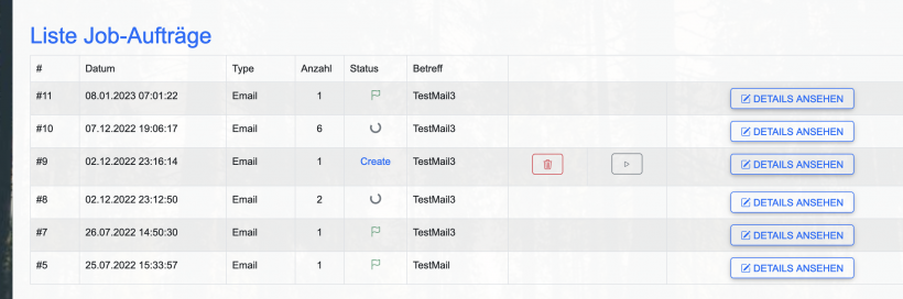 Hier haben sie die Übersicht über die Jobsufträge, Mails die gesendet wurden, werden mit einer Fahne angezeigt. Create bedeutet, dass die Mail noch nicht rausgegangen ist. Der Mistkübel lässt sie den Vorgang löschen. Der Pfeil hingegen, lässt sie das Mail aussenden. Unter Details ansehen: gelangen sie zur Übersicht des Emails, welchen Status das Mail hat (z.B. finished,...) sowie an welche Mailadressen es gesendet wurde. (Bild siehe unten)