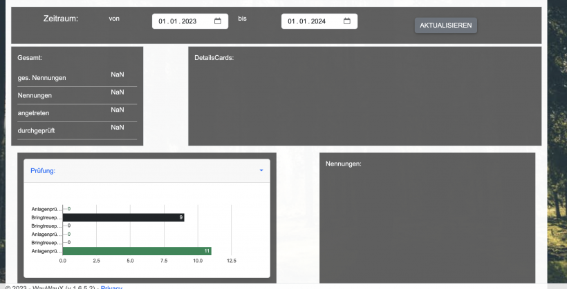 Die Statistik gibt Auskunft, über die Anzahl der unterschiedlichen Prüfungen, über die Nennungen, die angetretenen Gespanne, sowie die durchgeführten Prüfungen. Sie können im oberen Feld "Zeitraum" die Zeit definieren, die sie genau gelistet haben wollen. Durch Klicken auf Aktualisieren, wird die Seite neu geladen.