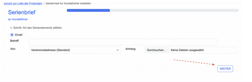 Im Serienbrief können sie einen Betreff nennen, eine Datei anfügen und die Versandmailadresse definieren, sind diese Schritte erfolgreich abgeschlossen, füllt sich der obere Balken blau und sie können auf "weiter" Klicken.