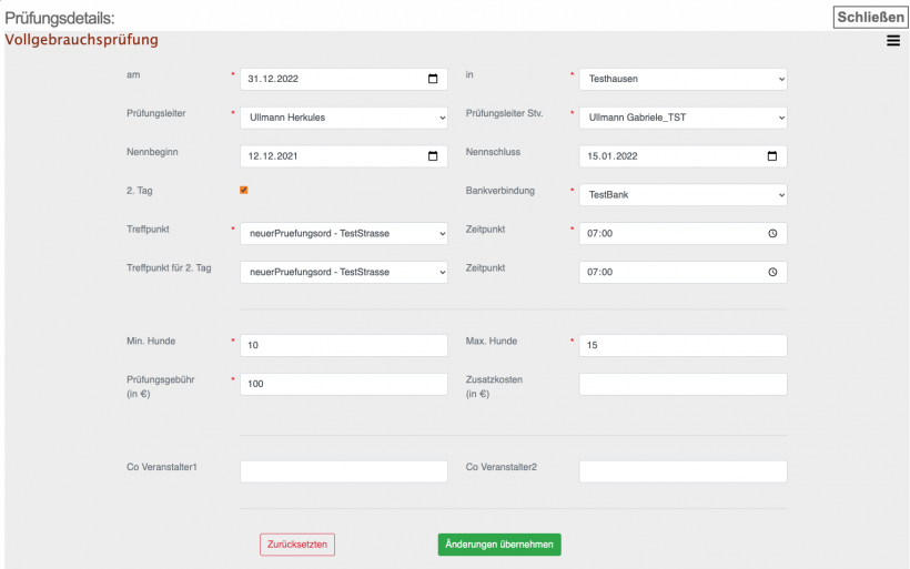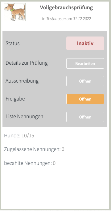 Grundsätzlich gilt für eine Prüfung zwei Statuszustände. Vor der Freigabe der Prüfung: Hier besteht noch die Möglichkeit, Angaben und Ausschreibung abzuändern. In diesem Stadium ist die Prüfung nicht online und damit für ausersehende nicht zu sehen. Nach der Freigabe der Prüfung: Angaben sowie die Prüfungsausschreibung sind festgeschrieben und können nicht mehr abgeändert werden. Ab diesen Moment ist die Prüfung online und über das Online-Nennformular ersichtlich.